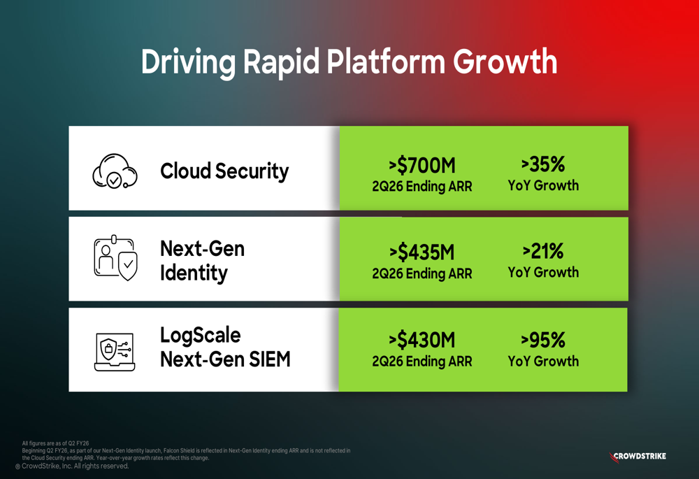 CrowdStrike’s platform components are experiencing rapid growth, with combined ending ARR for Cloud Security, Next-Gen Identity, and LogScale Next-Gen SIEM exceeding $1.56 billion and growing over 40% year-over-year: