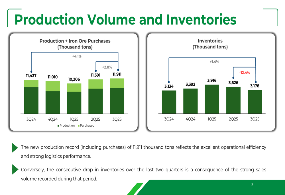 Sales volume set an unprecedented record at 12.4 million tons, marking the first time the company exceeded 12 million tons in quarterly sales. This represents a 4.3% year-over-year increase and a 4.8% improvement from Q2 2025. The strong sales performance contributed to a consecutive drop in inventory levels, which fell by 12.4% quarter-over-quarter to 3.2 million tons.