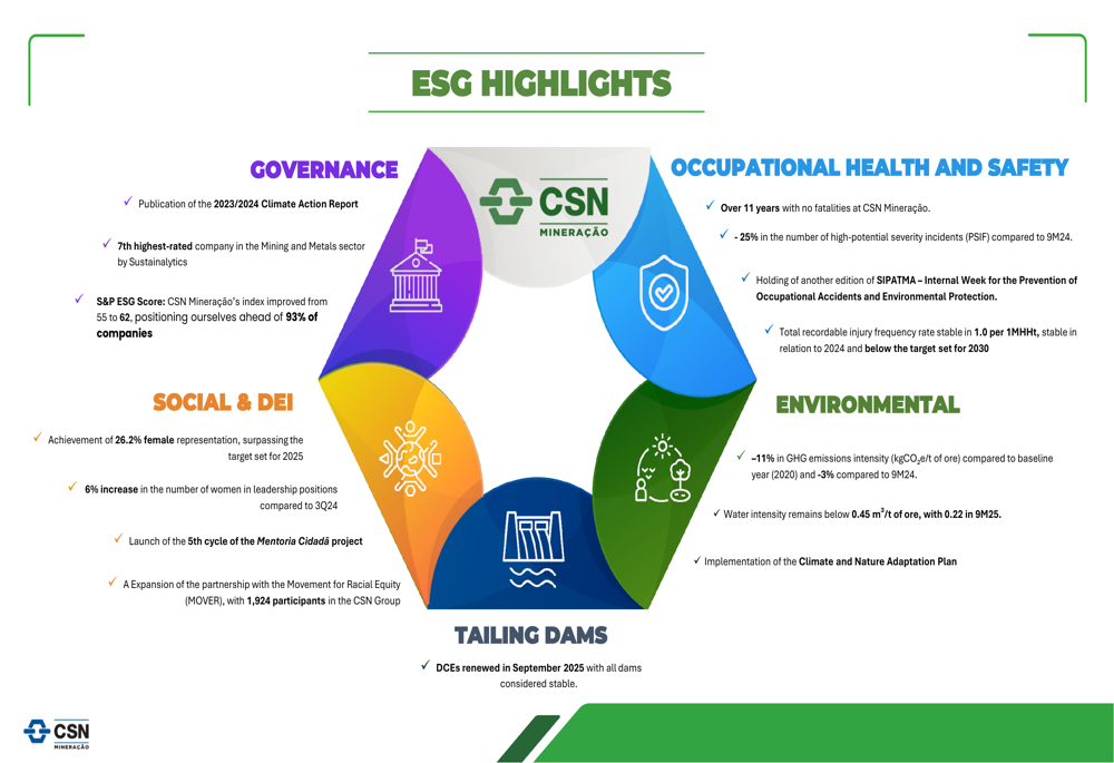On the sustainability front, CSN Mineração highlighted several ESG achievements, including the publication of its 2023/2024 Climate Action Report and recognition as the 7th highest-rated company by Sustainalytics. The company surpassed its 2025 target for female representation, achieving 26.2%, and maintained its strong safety record with over 11 years without fatalities.
