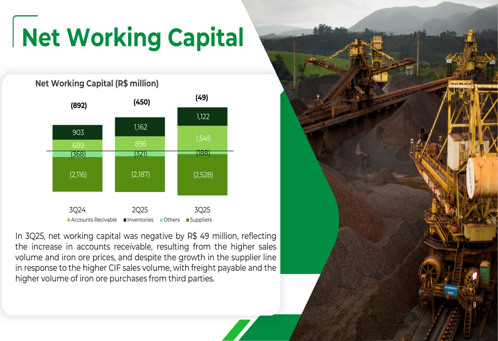 Working capital management showed improvement, with net working capital reduced to a negative R$49 million. This reflects an increase in accounts receivable offset by growth in the supplier line, driven by higher freight payables and increased third-party iron ore purchases.