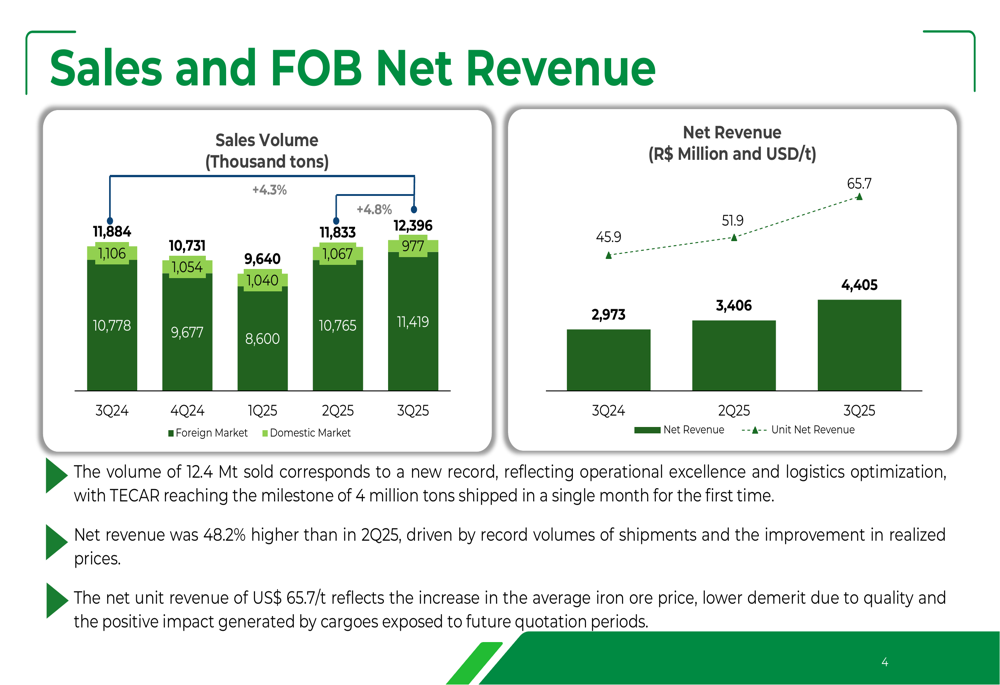 Net revenue surged to R$4,405 million, a remarkable 48.2% increase compared to the previous quarter. This growth was driven by both the record shipment volumes and improved unit net revenue, which reached US$65.7/ton, reflecting higher iron ore prices and lower quality demerits.