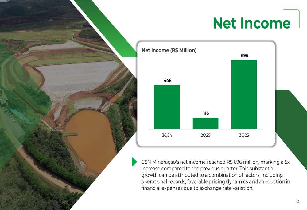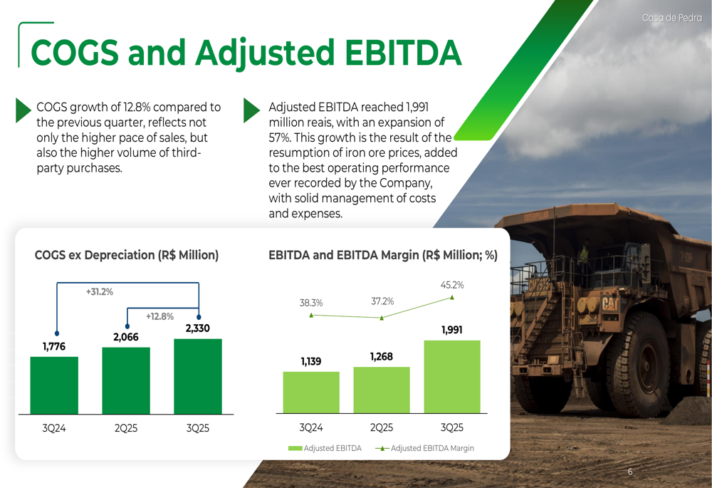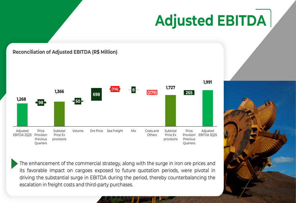 Adjusted EBITDA reached R$1,991 million with a 45.2% margin, representing a 57% expansion compared to Q2 2025. This remarkable improvement stemmed from higher iron ore prices and the company's best-ever operating performance, supported by effective cost and expense management.