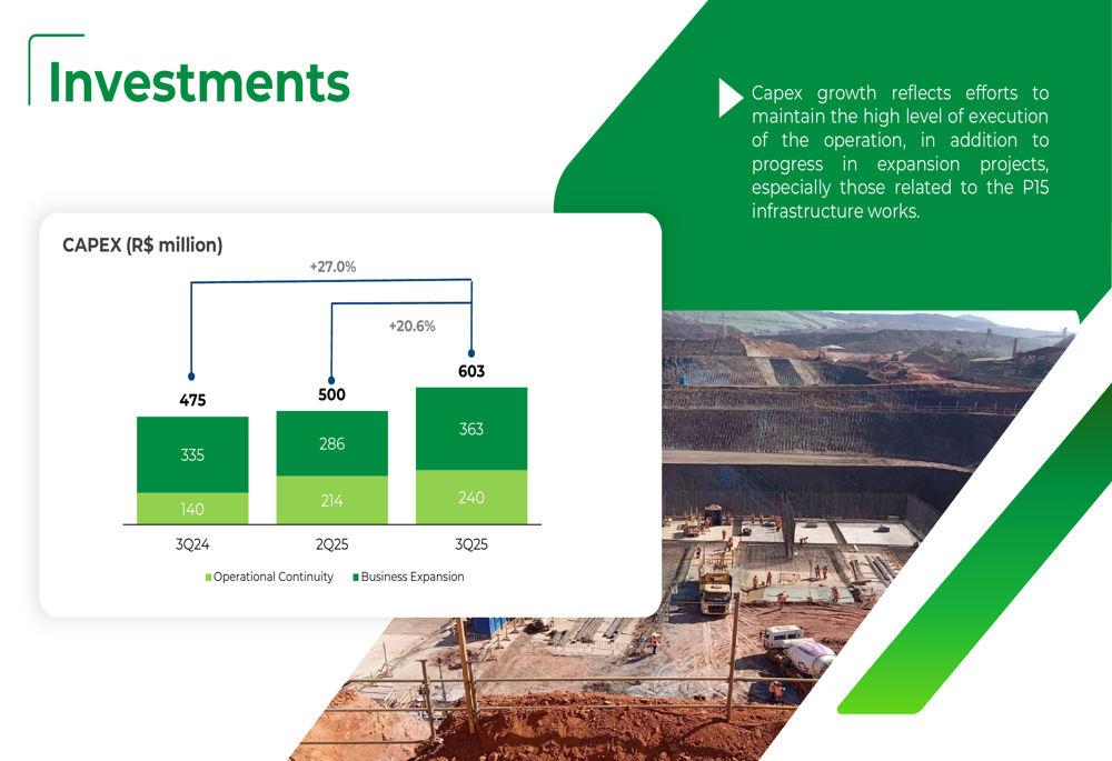 Capital expenditures increased by 20.6% quarter-over-quarter to R$603 million, reflecting the company's commitment to maintaining operational efficiency while advancing expansion projects. The CAPEX was divided between operational continuity (R$363 million) and business expansion (R$240 million), with particular emphasis on infrastructure works related to the P15 project.