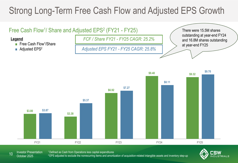 The company’s strong free cash flow generation has supported its growth strategy and shareholder returns. From FY21 to FY25, CSW Industrials achieved a free cash flow per share CAGR of 25.2% and an adjusted EPS CAGR of 25.8%, as shown in the following chart: