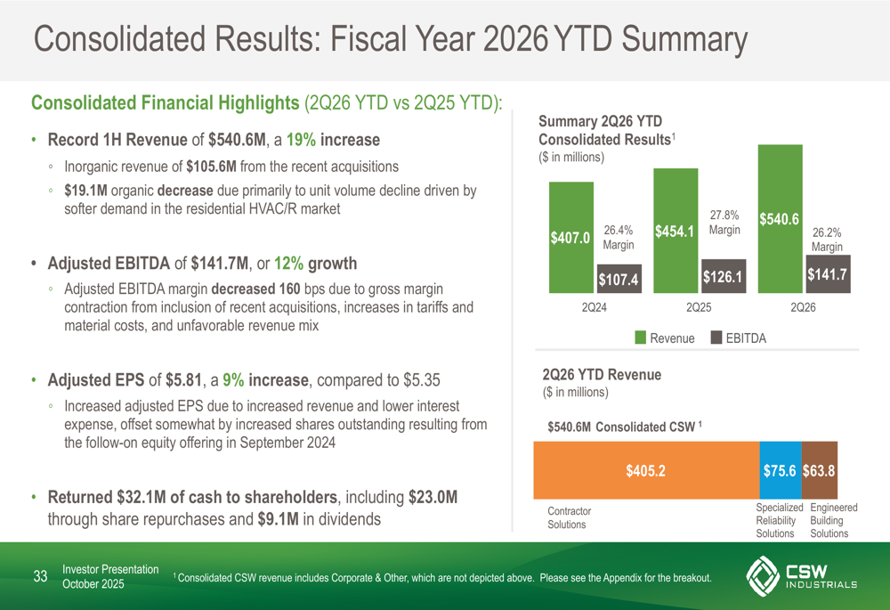 CSW Industrials Inc (NASDAQ:CSWI) reported strong financial results for its fiscal second quarter of 2026, with revenue increasing 22% year-over-year to $277 million. The company’s presentation, released on October 30, 2025, revealed that growth was primarily driven by acquisitions, which contributed $61.9 million in inorganic revenue, while organic revenue declined by $12.9 million.