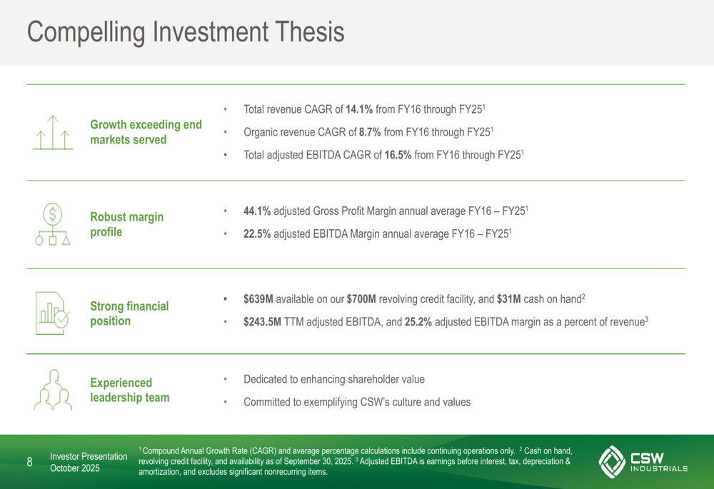 CSW Industrials’ investment thesis centers around growth exceeding end markets, robust margin profile, strong financial position, and experienced leadership. The company has delivered impressive financial results, with total revenue CAGR of 14.1% and organic revenue CAGR of 8.7% from FY16 through FY25.
