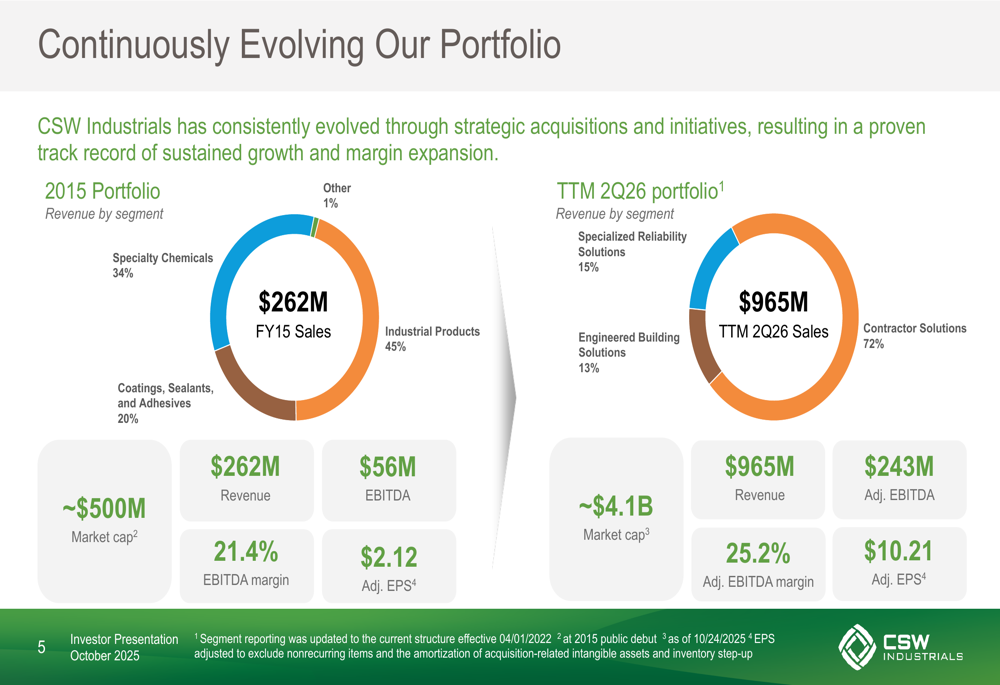 CSW Industrials has undergone a significant transformation since its spin-off in 2015. The company has evolved from a diversified portfolio with relatively balanced revenue distribution across segments to a business heavily focused on Contractor Solutions, which now accounts for 72% of trailing twelve months revenue.