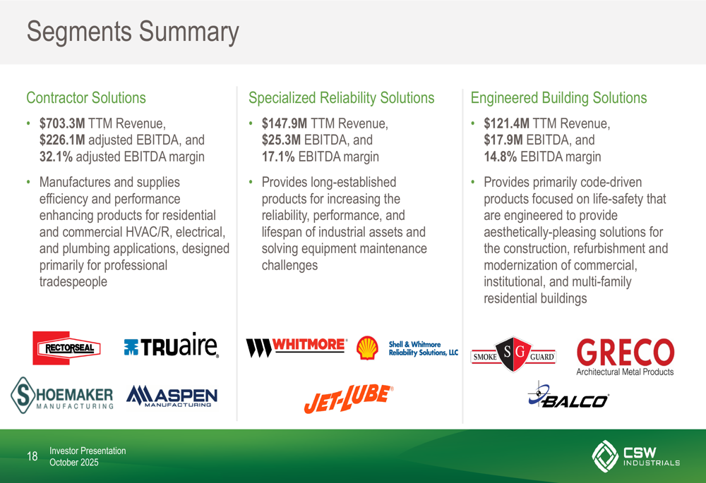 The following segment summary provides a comprehensive breakdown of CSW Industrials’ three business segments and their respective performance metrics: