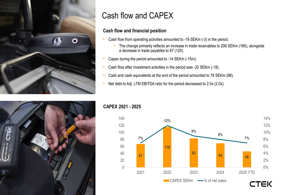 CTEK’s capital expenditure during Q3 2025 amounted to 14 MSEK, in line with the previous period’s 15 MSEK. The company maintained its net debt ratio at 2.0x, well below its target of 3.0x, indicating a relatively stable financial position despite the challenging operating environment.