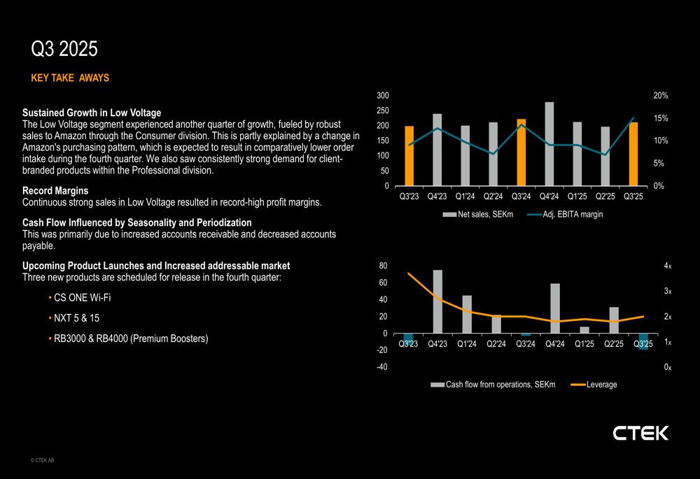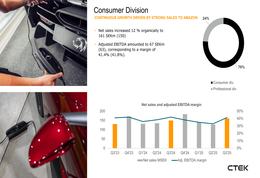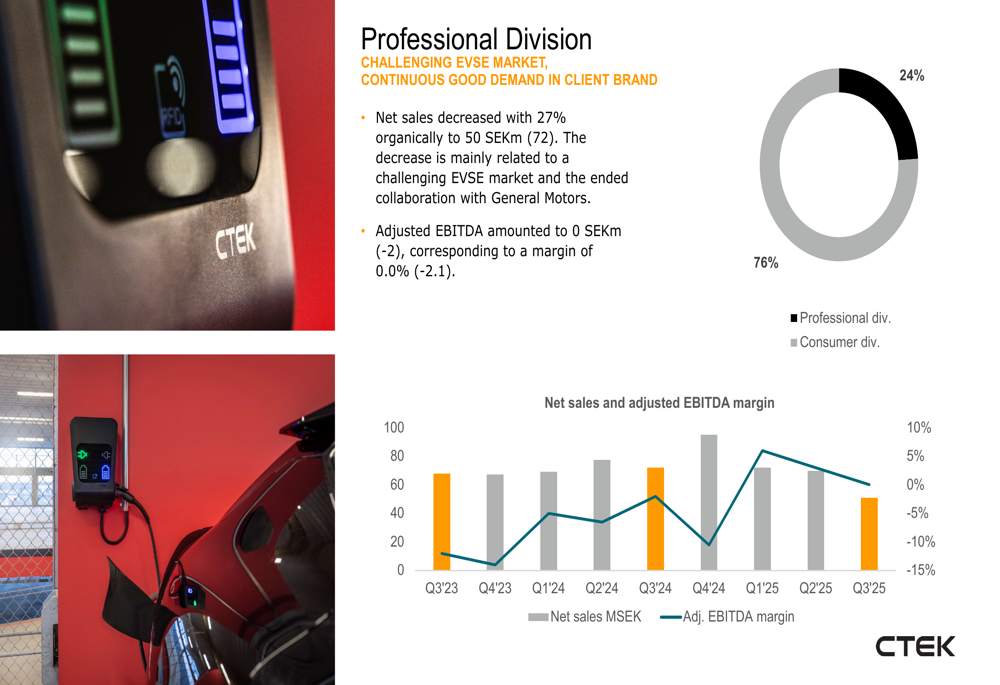 CTEK’s performance varied significantly between its two main divisions. The Consumer division, which focuses on battery chargers and boosters, demonstrated robust growth with net sales increasing 12% organically to 161 MSEK. This division also maintained strong profitability with an adjusted EBITDA of 67 MSEK and a margin of 41.4%.