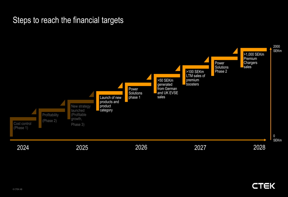CTEK presented a clear roadmap for achieving its financial targets through 2028, outlining a phased approach that begins with cost control and profitability improvements before transitioning to growth-focused initiatives.