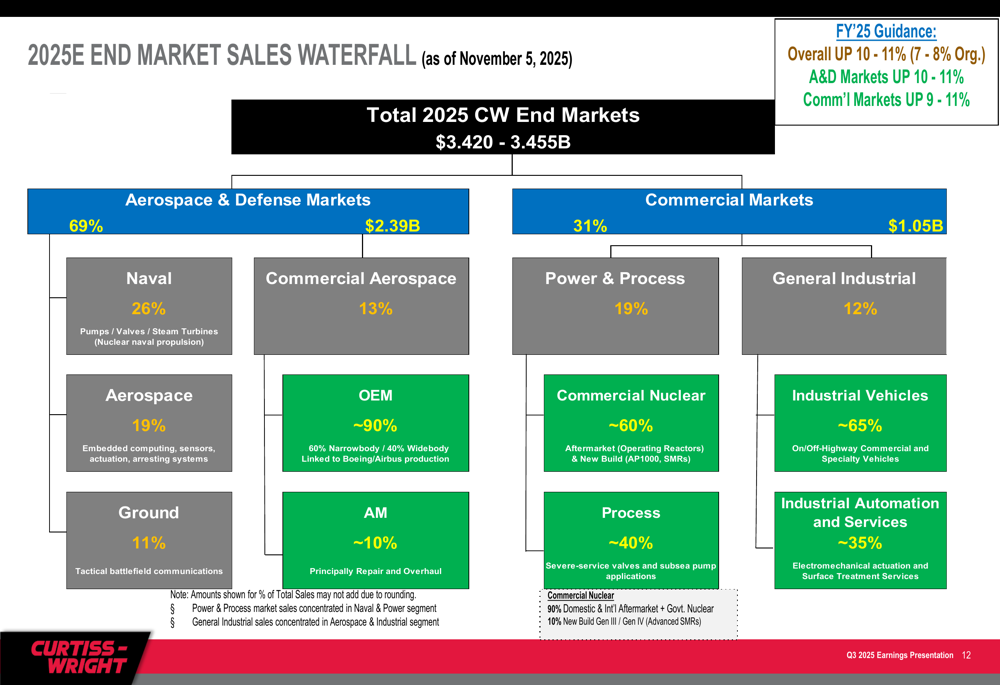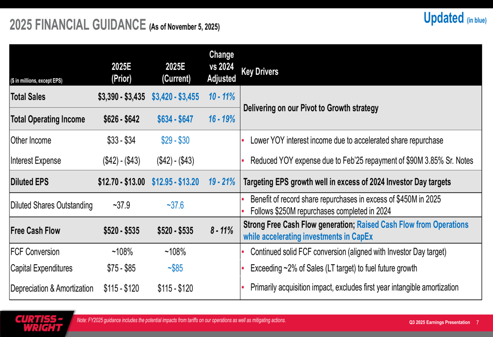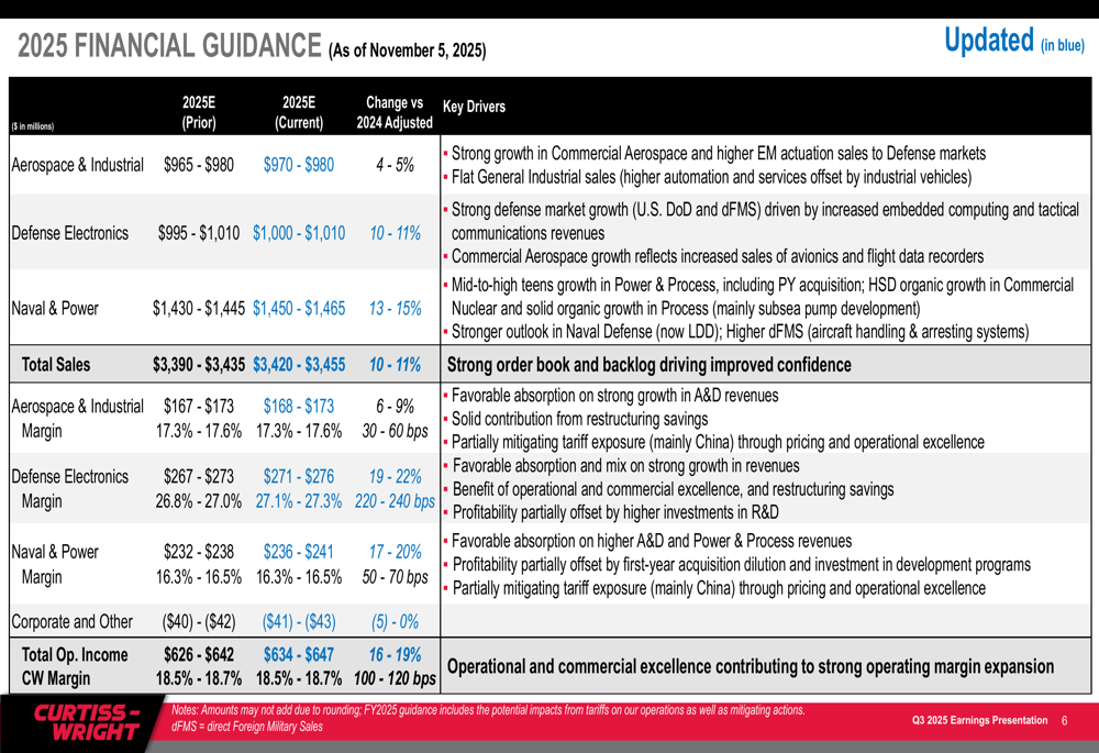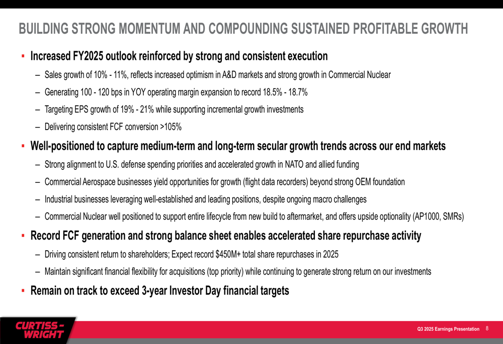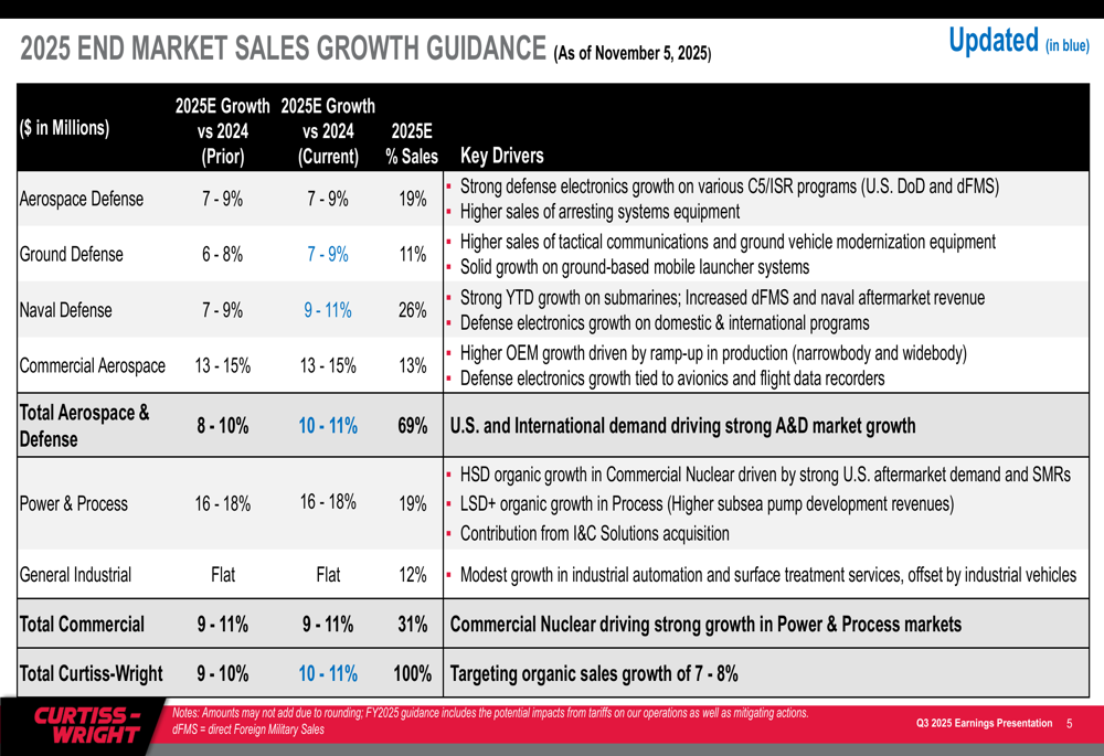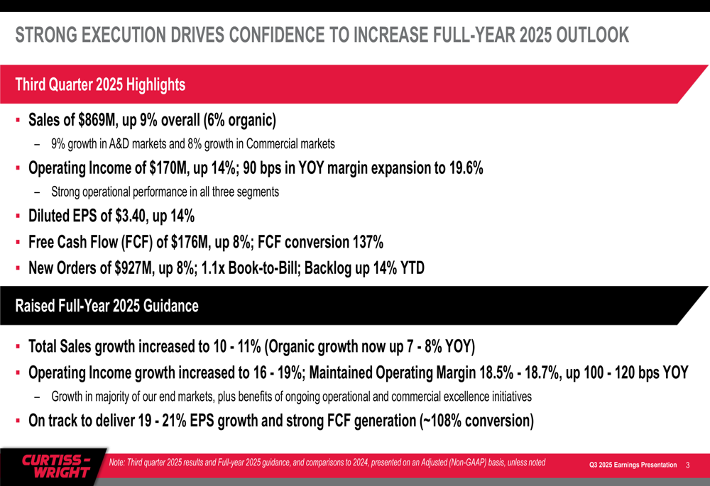 Based on the strong Q3 performance, Curtiss-Wright raised its full-year 2025 guidance across key metrics. The company now projects total sales growth of 10-11%, up from the previous guidance of 9-10%, with organic growth of 7-8%.