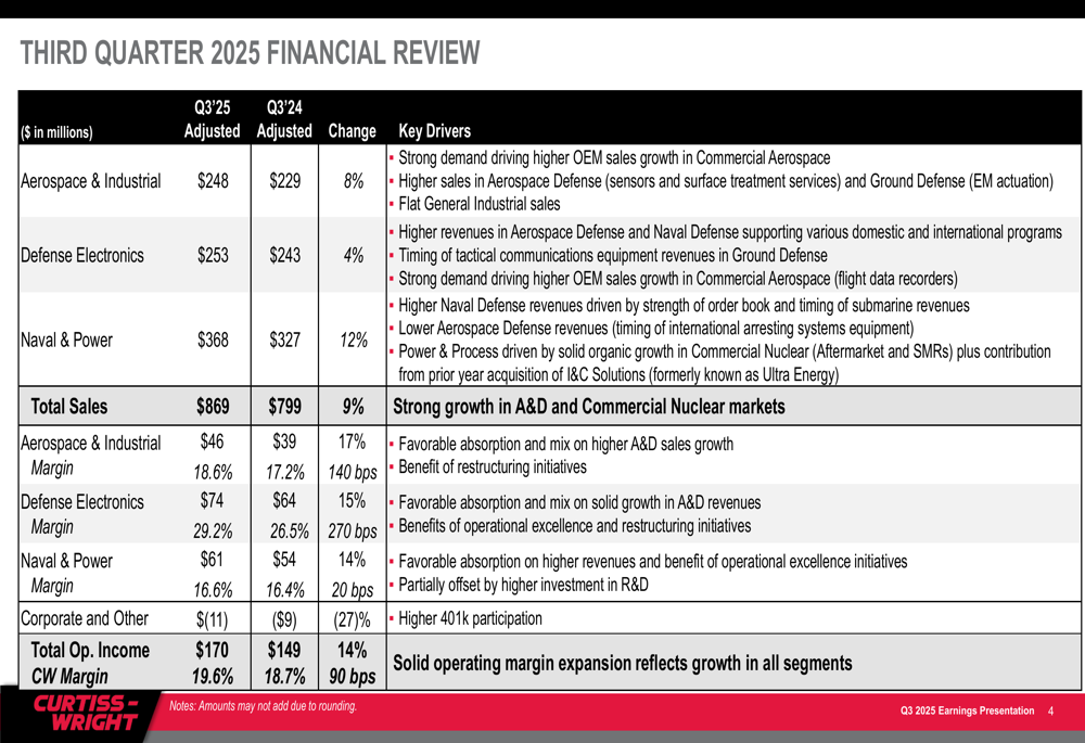 Curtiss-Wright delivered impressive third-quarter results, with sales reaching $869 million, representing a 9% increase (6% organic) compared to the same period last year. The company reported operating income of $170 million, up 14% year-over-year, with operating margin expanding by 90 basis points to 19.6%. Diluted earnings per share grew 14% to $3.40, exceeding analyst expectations of $3.30.