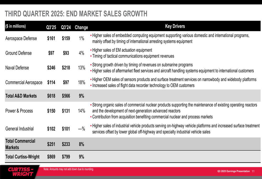 The company's end market sales growth for Q3 2025 shows strength across both defense and commercial sectors: