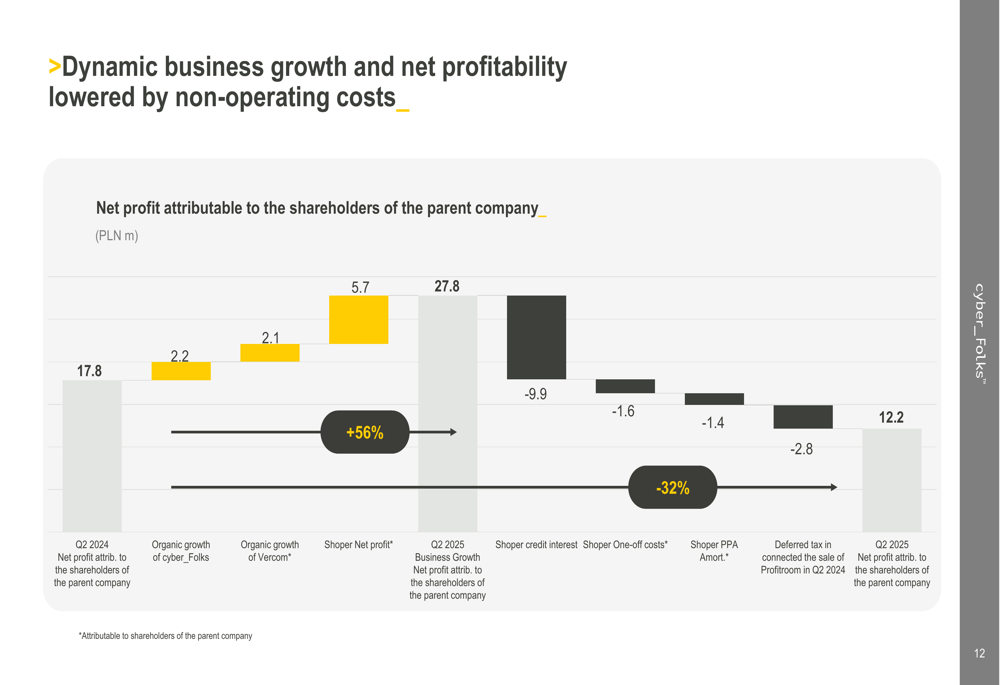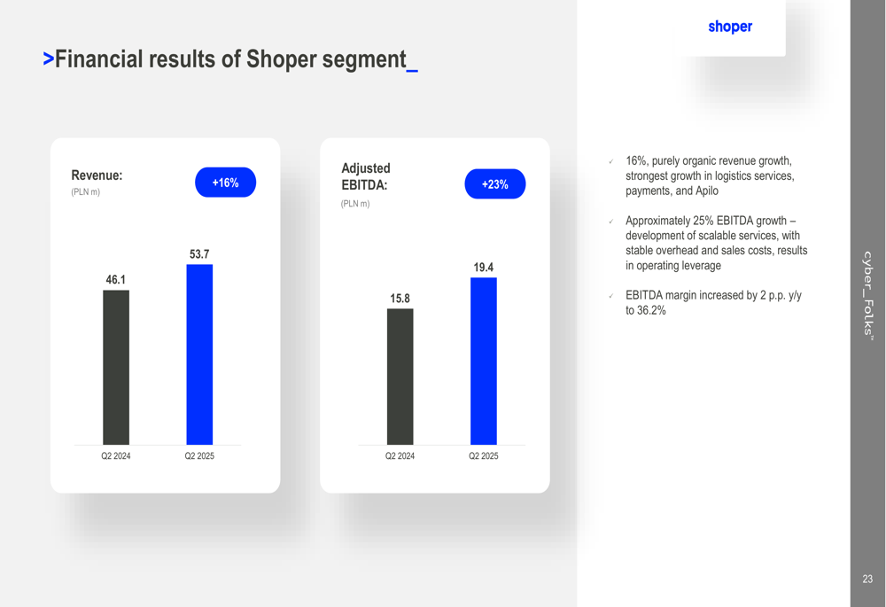 However, net profit attributable to shareholders declined 32% year-over-year to PLN 12.2 million, primarily due to costs associated with the Shoper acquisition, including credit interest (PLN 9.9 million), one-off costs (PLN 1.6 million), and PPA amortization (PLN 1.4 million). Excluding these acquisition-related expenses, the underlying business growth resulted in a net profit of PLN 27.8 million, representing a 56% increase from Q2 2024.