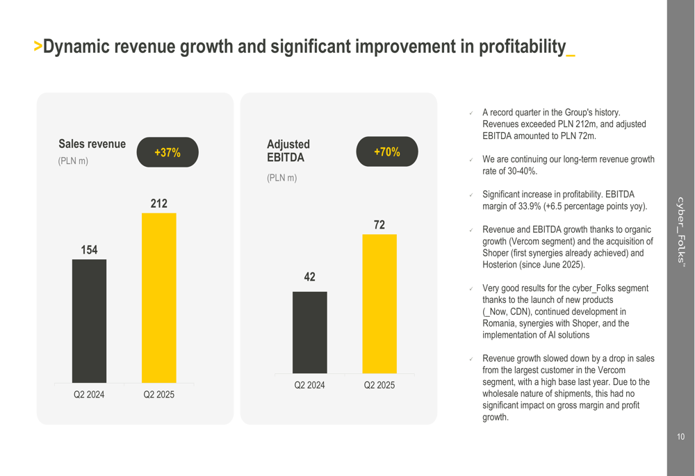 Cyber_Folks reported exceptional Q2 2025 results with sales revenue reaching PLN 212 million, a 37% increase year-over-year, while adjusted EBITDA surged 70% to PLN 72 million. The company’s EBITDA margin expanded significantly to 33.9%, representing a 6.5 percentage point improvement compared to the same period last year.