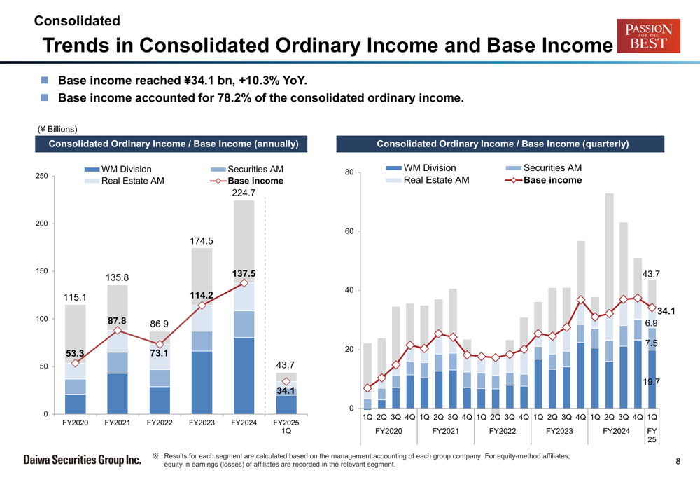 Daiwa Securities Group continues to focus on expanding its asset-based revenues and enhancing its total asset consulting services. The banking arm, Daiwa Next Bank, showed particularly strong growth with ordinary income increasing 53.8% year-over-year to 4.4 billion yen.