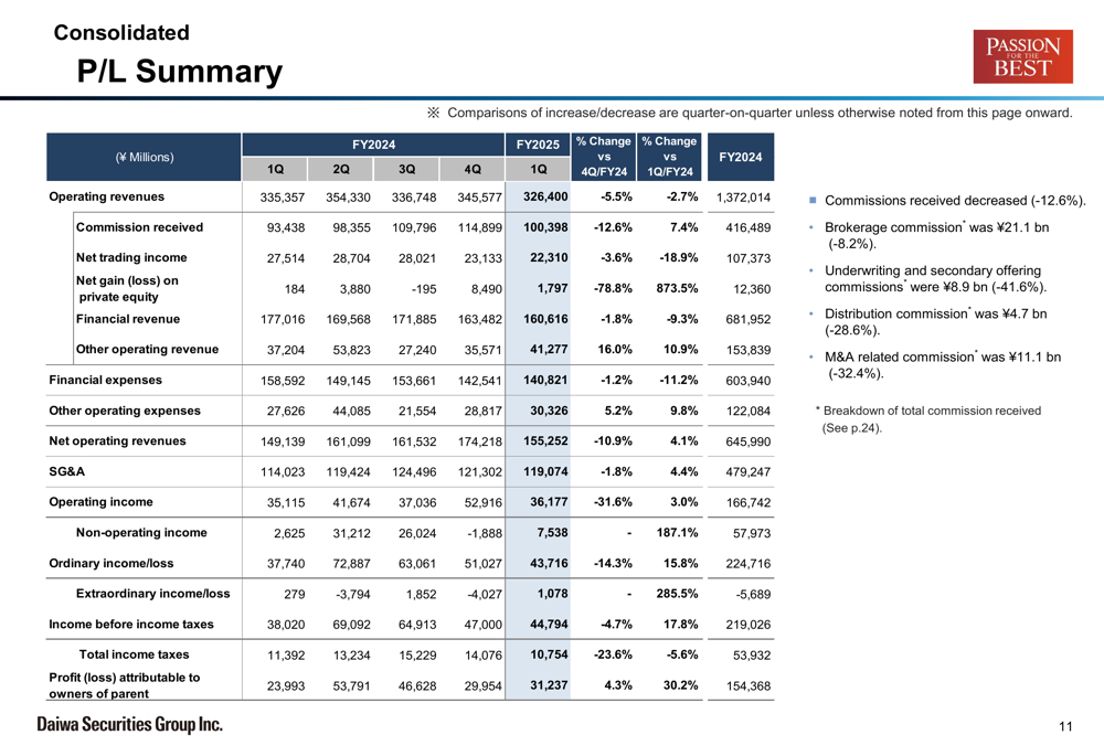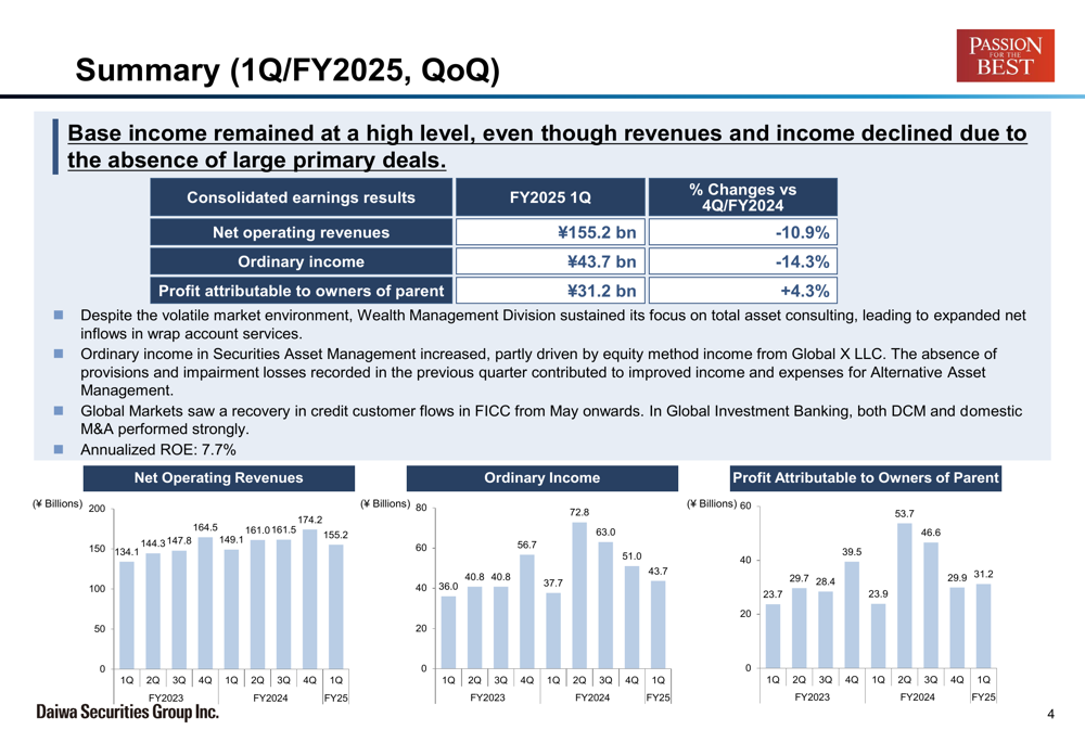 Daiwa Securities reported substantial year-over-year growth across major financial metrics for Q1 FY2025. Net operating revenues increased 4.1% to 155.2 billion yen, ordinary income rose 15.8% to 43.7 billion yen, and profit attributable to owners of parent jumped 30.2% to 31.2 billion yen.