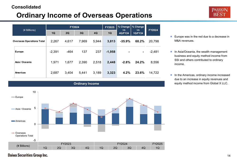Daiwa Securities’ overseas operations delivered mixed results across regions. Overall, overseas operations generated 3.8 billion yen in ordinary income, representing a 35.9% increase year-over-year.