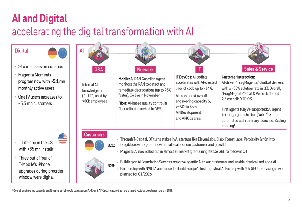 Artificial intelligence has emerged as a key strategic focus for Deutsche Telekom, with AI initiatives being implemented across all business segments. The company reported that its internal AI knowledge bot is now used by more than 80,000 employees, while AI-driven coding has accelerated development with up to 14% of code being AI-created.
