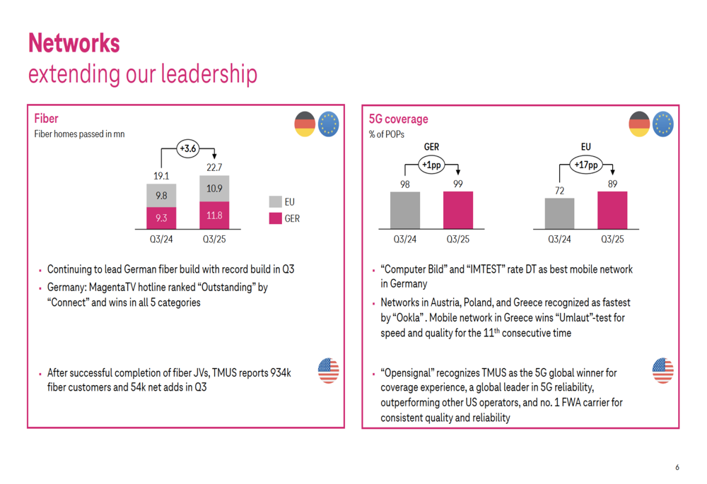 Deutsche Telekom continues to invest heavily in network infrastructure, extending its leadership in both fiber and 5G coverage. The company has expanded its fiber network to reach 11.8 million homes in Germany, up from 9.3 million a year ago, while 5G coverage has reached 99% of the German population and 89% across Europe.