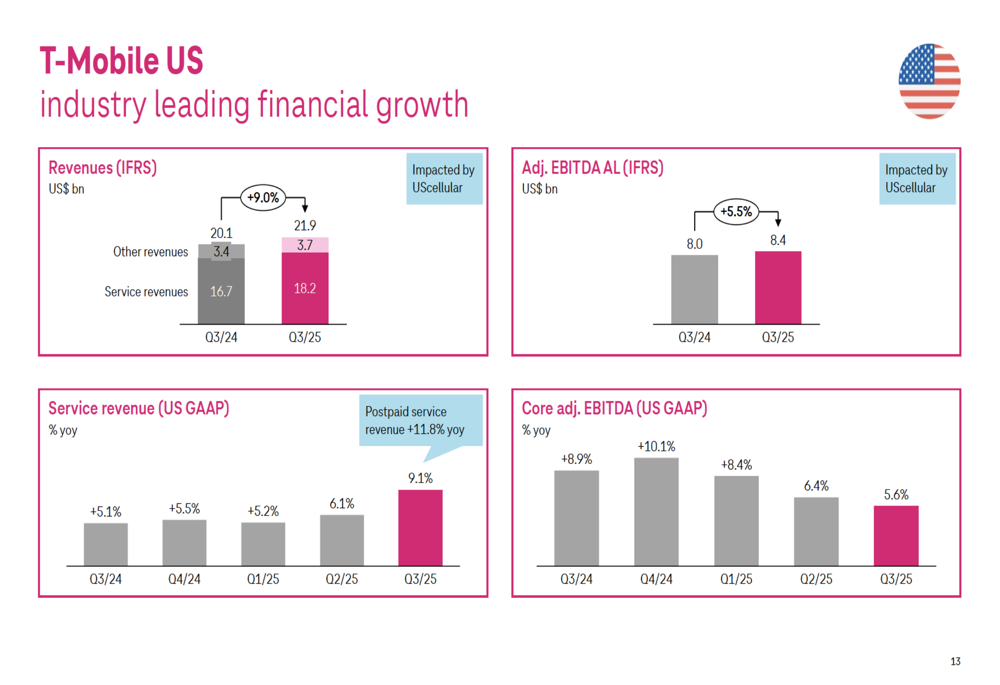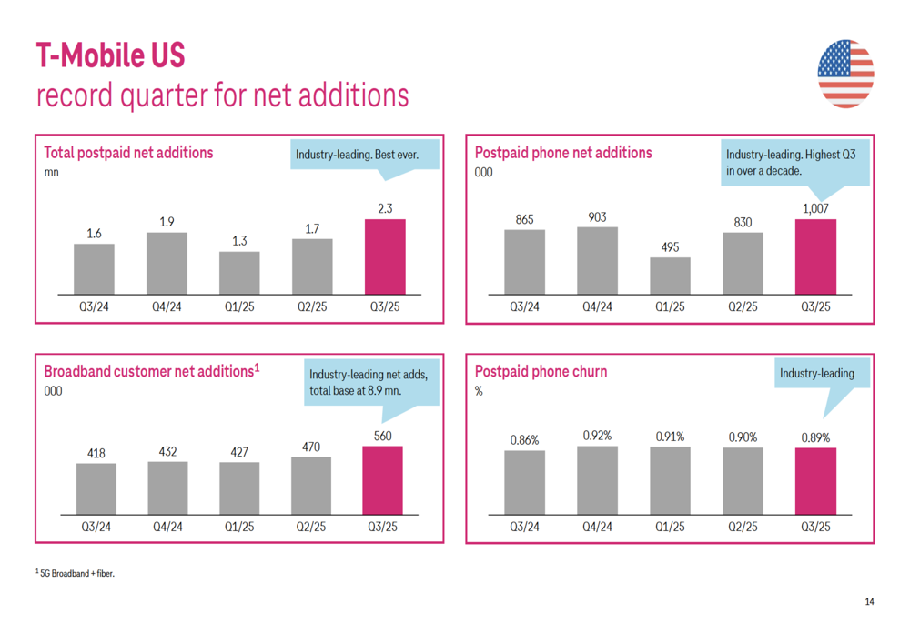T-Mobile US continues to be the growth engine for Deutsche Telekom, delivering exceptional customer acquisition results. The US subsidiary reported a record 2.3 million total postpaid net additions in Q3 2025, up significantly from 1.6 million in Q3 2024. Postpaid phone net additions reached 1,007,000, while broadband customer net additions jumped to 560,000.