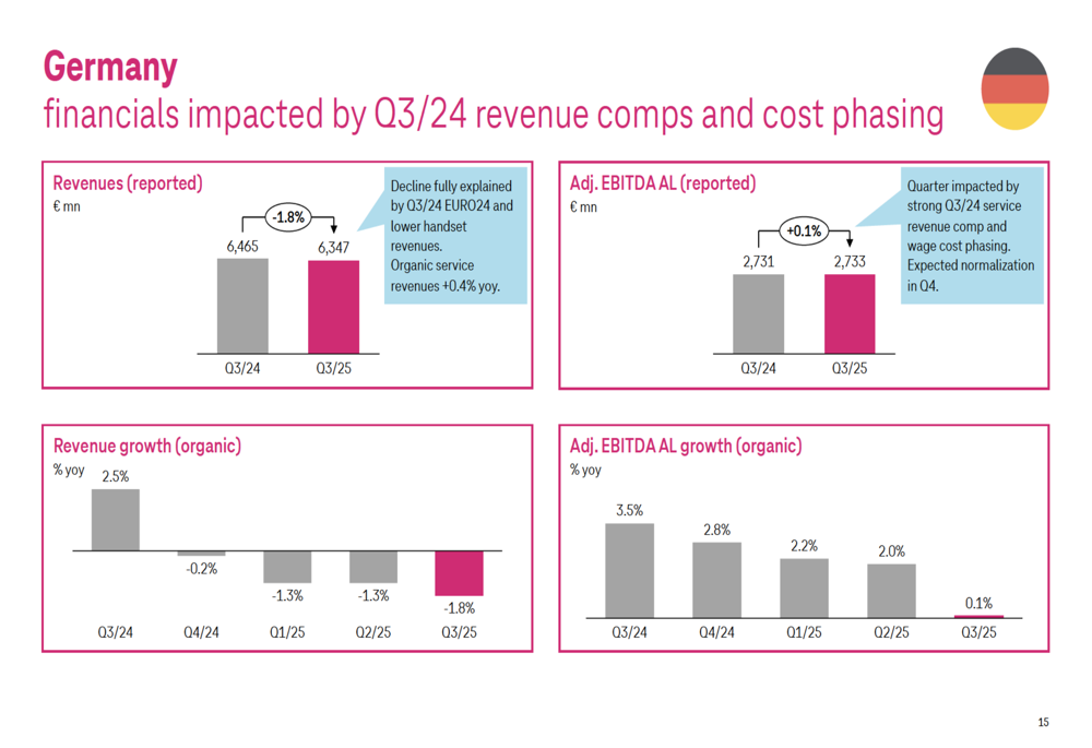 Fixed service revenue in Germany declined by 0.3% year-over-year, a significant drop from the 2.1% growth seen in Q3 2024. Mobile service revenue growth also slowed slightly to 1.8% from 2.1% a year earlier.