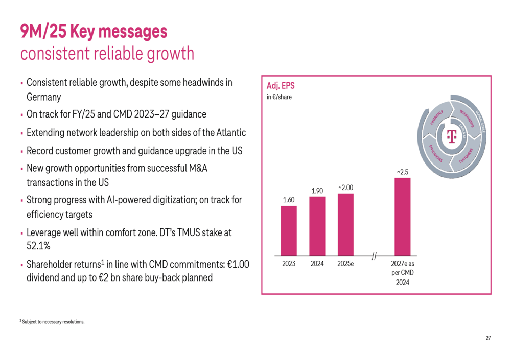 Looking further ahead, Deutsche Telekom projects adjusted EPS to reach €2.50 by 2027, supported by continued investments in network infrastructure and digital transformation. The company also plans to pay a dividend of €1.00 per share and has announced a share buyback program of up to €2 billion in 2026.