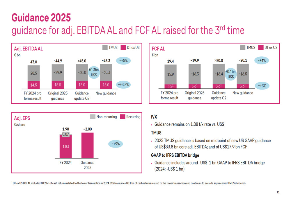 Deutsche Telekom presented its Q3 2025 results on November 13, showing a mixed performance that nonetheless led the company to raise its full-year guidance. The telecommunications giant reported earnings per share of €0.55, exceeding analyst expectations of €0.5083 by 8.2%, while revenue of €28.9 billion fell slightly short of the forecasted €29.14 billion.