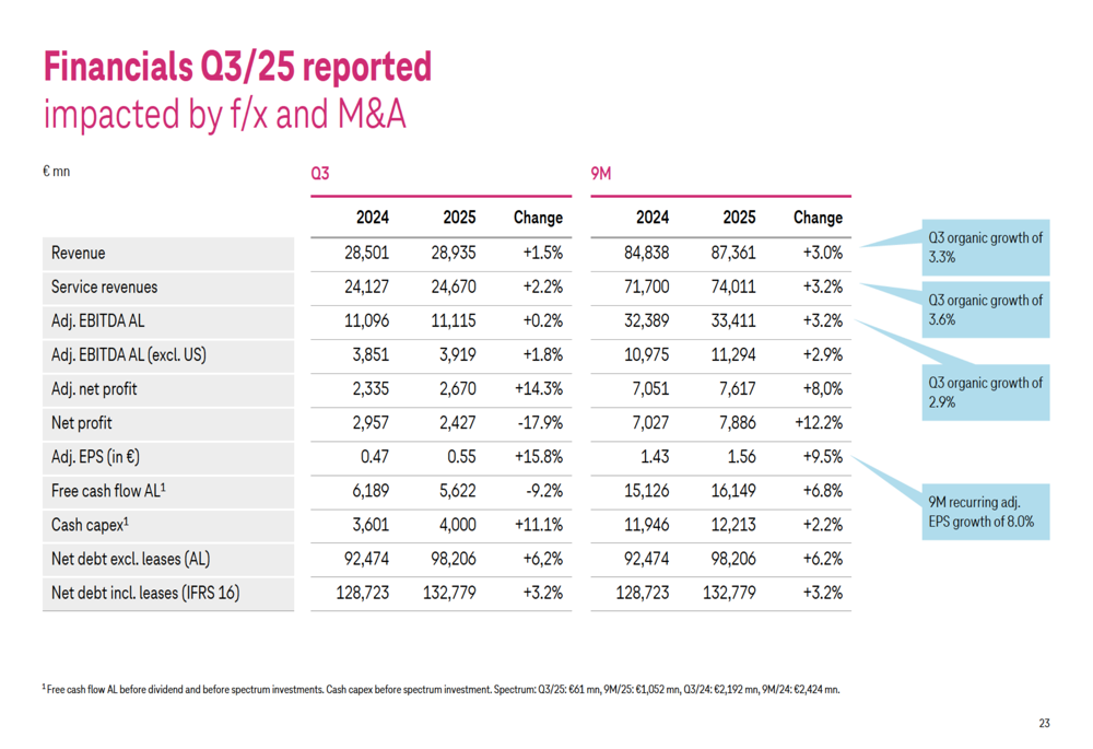 Deutsche Telekom delivered solid organic growth for the first nine months of 2025, with service revenues increasing by 3.7%, adjusted EBITDA AL (after leases) growing by 4.4%, and free cash flow AL rising by 6.8% on an organic basis. Adjusted earnings per share showed strong growth of 9.5% year-over-year.