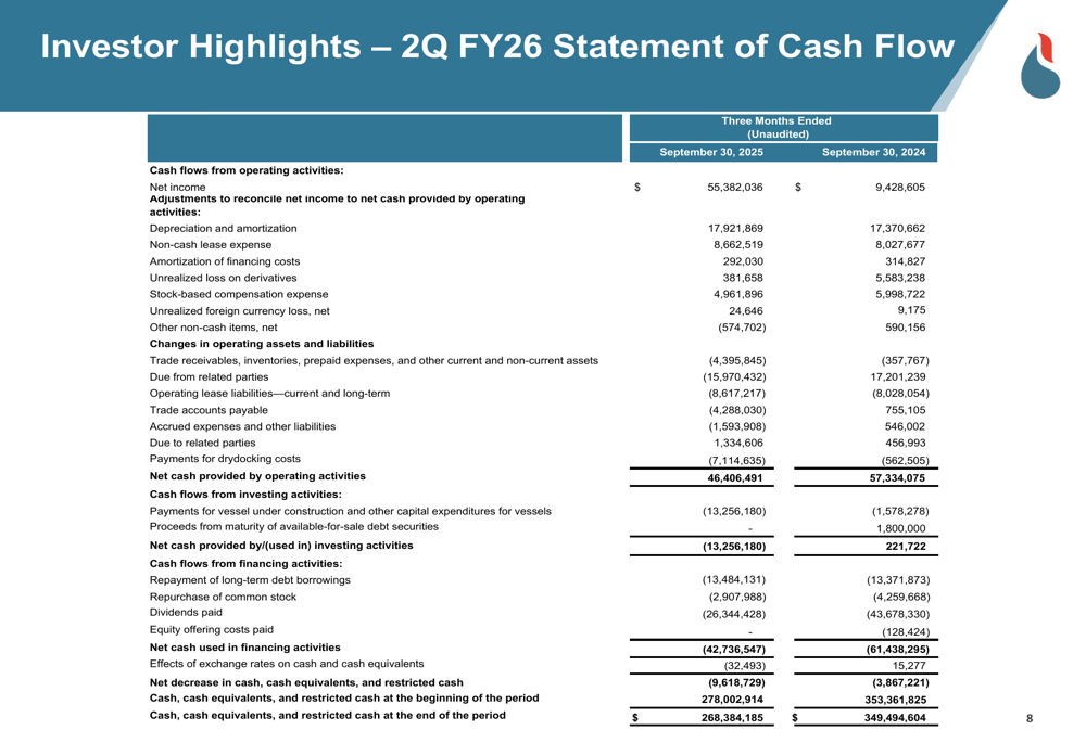 Dorian LPG emphasized its sustainability efforts and fleet efficiency initiatives in the presentation. The company operates 16 scrubber-fitted vessels and five dual-fuel LPG vessels, with scrubber vessel daily savings for calendar Q3 2025 reported at $1,140 per calendar day net of all scrubber operating expenses.