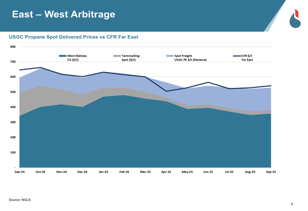 East-West arbitrage opportunities remain a key driver for VLGC demand. The presentation included analysis of price differentials between U.S. Gulf Coast propane and Far East markets, which influence shipping routes and vessel utilization.