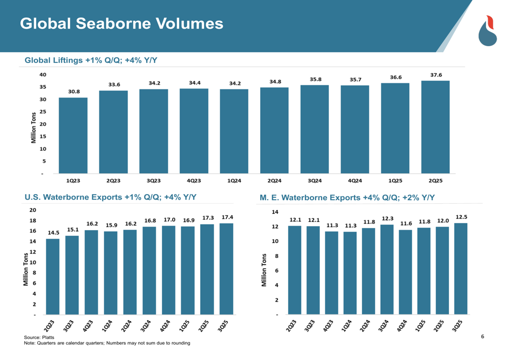 The presentation highlighted growing global LPG trade volumes, with global liftings increasing 1% quarter-over-quarter and 4% year-over-year. U.S. waterborne exports showed similar growth patterns, while Middle East waterborne exports grew 4% quarter-over-quarter and 2% year-over-year.