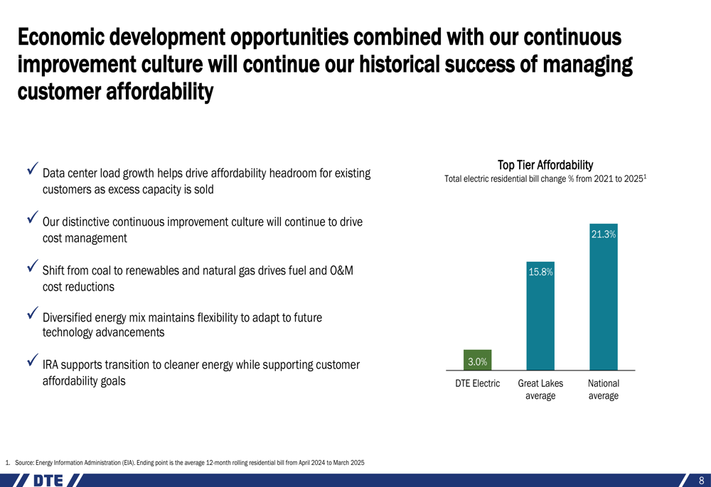 A key focus of DTE’s presentation was its ability to maintain customer affordability despite significant investments. The company highlighted its performance in this area compared to regional and national averages, noting that DTE Electric’s residential bill has increased by only 3.0% from 2021 to 2025, compared to a Great Lakes average of 15.8% and a national average of 21.3%.