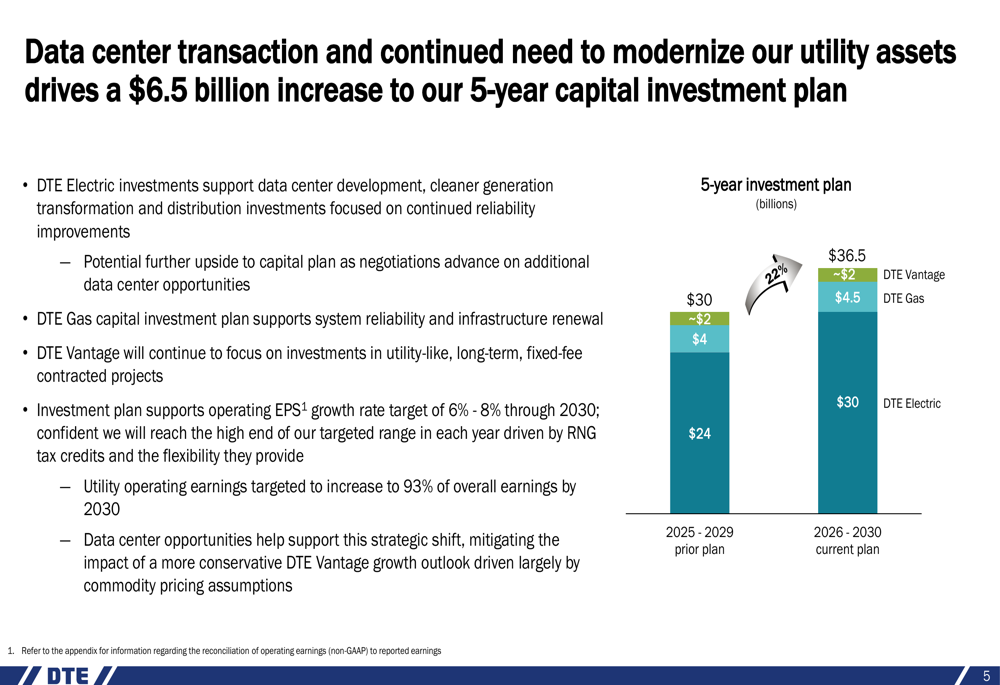 The company’s presentation revealed a substantial increase in its five-year capital investment plan, driven primarily by data center development and utility modernization efforts. The updated plan for 2026-2030 totals approximately $36.5 billion, representing a 22% increase from the previous 2025-2029 plan of $30 billion.