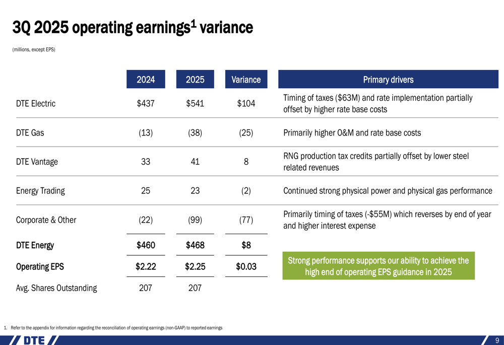 DTE Energy reported third-quarter 2025 operating earnings of $468 million, up from $460 million in the same period last year. On a per-share basis, operating EPS reached $2.25, compared to $2.22 in Q3 2024. This performance was primarily driven by DTE Electric, which saw a substantial increase in earnings.