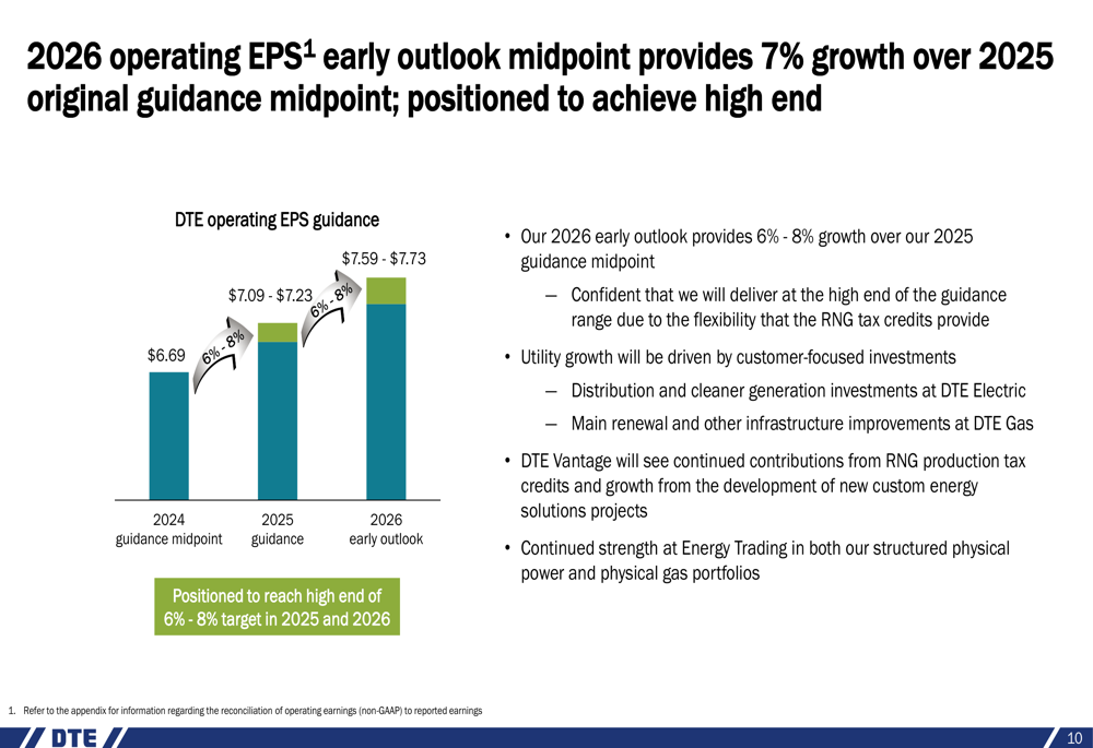 DTE Energy provided an early outlook for 2026, projecting operating EPS growth of 6-8% over the 2025 guidance midpoint. The company expressed confidence in achieving the high end of its 2025 operating EPS guidance range of $7.09-$7.23, and maintaining its long-term operating EPS growth rate target of 6-8% through 2030.
