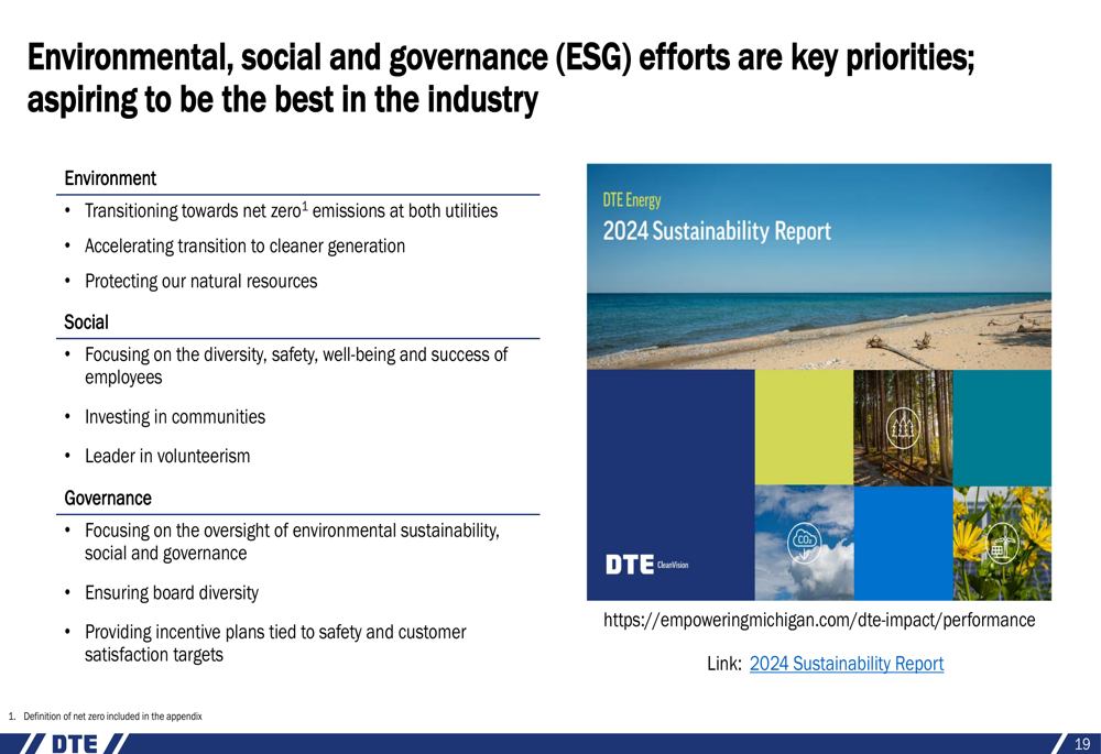 The presentation reinforced DTE’s governance focus on environmental sustainability oversight, board diversity, and incentive plans tied to safety and customer satisfaction targets.