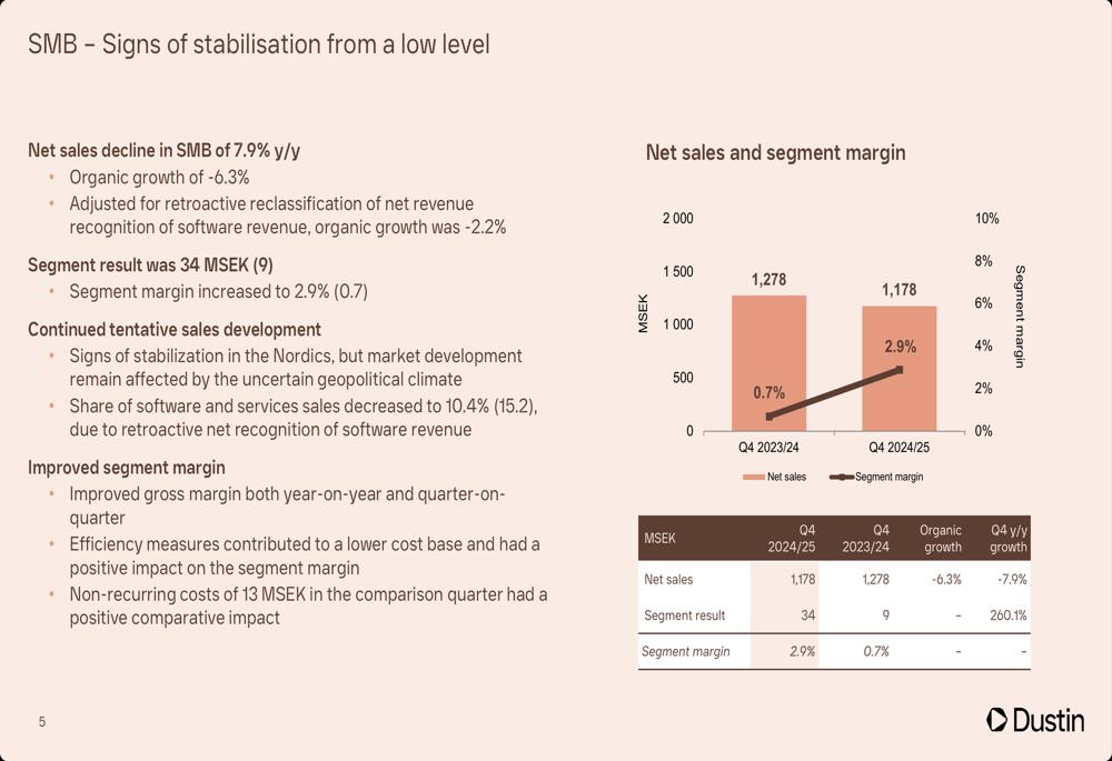 The Small and Medium Business (SMB) segment showed signs of stabilization, though from a low level. Net sales declined by 7.9% year-over-year to 1,178 MSEK, with organic growth at -6.3%. However, when adjusted for retroactive reclassification of net revenue, organic growth was -2.2%. Despite the sales decline, segment profitability improved dramatically, with segment result increasing to 34 MSEK from 9 MSEK and segment margin expanding to 2.9% from 0.7%.