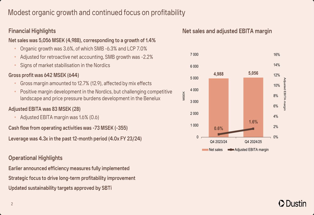 Dustin Group AB (DUST) reported its fourth quarter results for fiscal year 2024/25, showing modest sales growth but significantly improved profitability driven by extensive cost-cutting measures. The IT solutions provider, operating primarily across the Nordics and Benelux regions, continues to navigate a challenging market environment with divergent performance across its business segments.