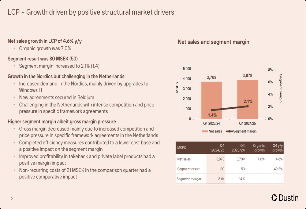 In contrast, the Large Corporate and Public (LCP) segment demonstrated solid growth, with net sales increasing by 4.6% year-over-year to 3,878 MSEK and organic growth of 7.0%. Segment result improved to 80 MSEK from 53 MSEK, with segment margin expanding to 2.1% from 1.4%. This growth was primarily driven by upgrades to Windows 11 in the Nordic region.