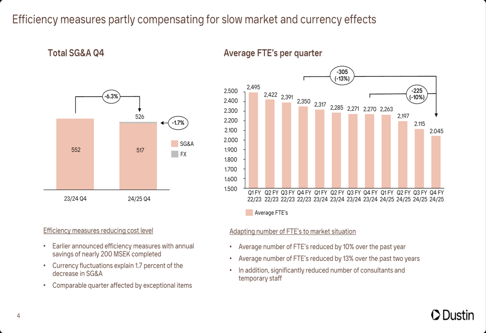 A key driver of Dustin's improved profitability was its extensive efficiency measures, which have compensated for slow market conditions and negative currency effects. Total SG&A expenses in Q4 decreased by 6.3% year-over-year, from 552 MSEK to 517 MSEK, with currency fluctuations accounting for -1.7% of this change.
