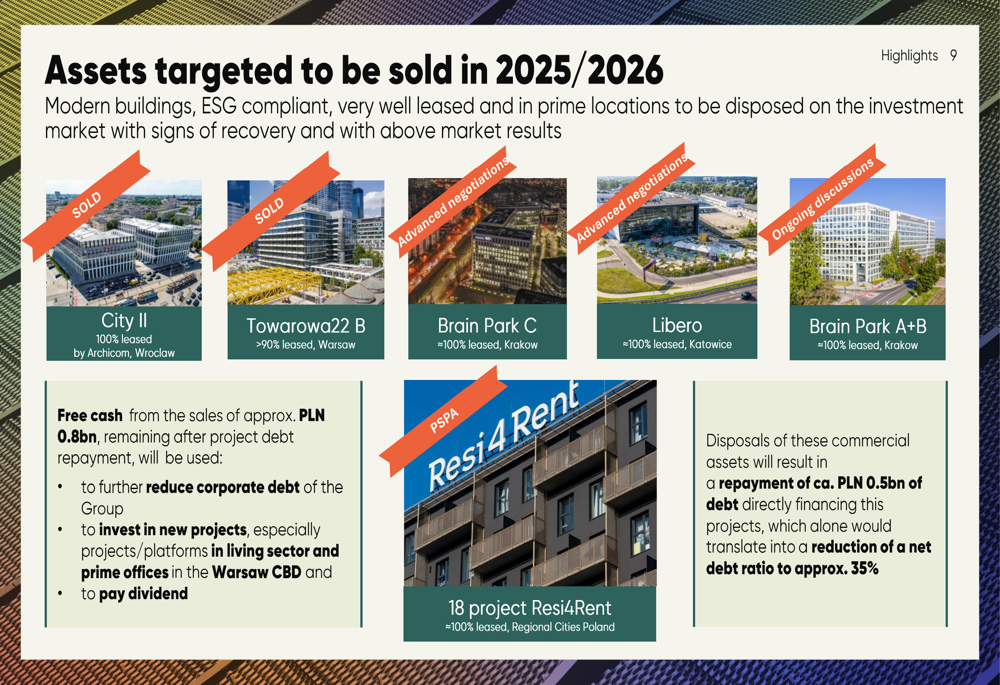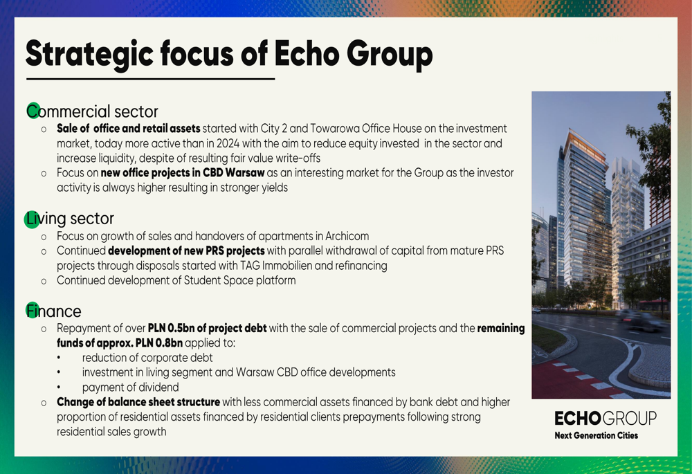 Echo Group is focused on reducing debt through commercial asset sales, with plans to reinvest remaining proceeds into future business growth and dividend payments. The company has targeted several fully leased assets for sale in 2025/2026, including City II, Towarowa 22 B, Brain Park C, Libero, and Brain Park A+B, which are expected to generate approximately PLN 0.8 billion in free cash.