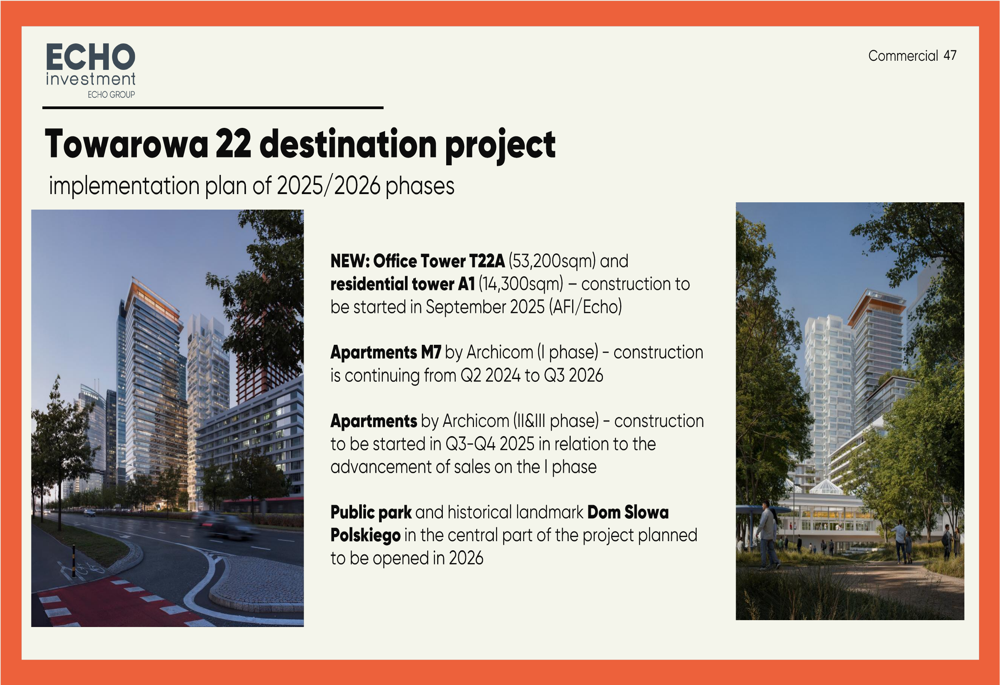 The company is also moving forward with the Towarowa 22 destination project in Warsaw, with construction of a new office tower (53,200 sqm) and residential tower (14,300 sqm) scheduled to begin in September 2025. This mixed-use development represents Echo’s continued commitment to high-quality urban projects despite its broader strategy of commercial asset divestment.