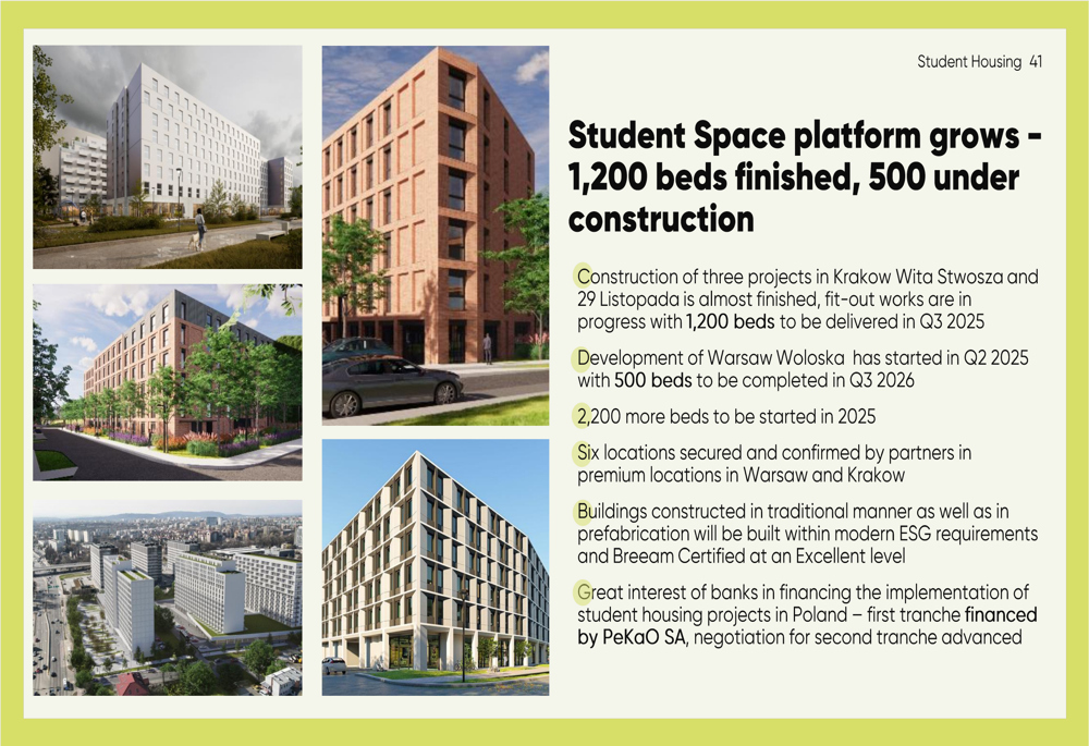 The company is also expanding its Student Space platform, with 1,200 beds to be delivered in Q3 2025 and plans to develop at least 5,000 beds within the next 3-5 years. Construction of three projects in Kraków is nearly complete, with fit-out works in progress, while development of a 500-bed project in Warsaw started in Q2 2025 with completion expected in Q3 2026.