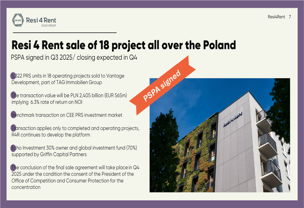A cornerstone of this strategy is the preliminary sale agreement for 18 Resi4Rent projects comprising 5,322 units to TAG Immobilien Group for PLN 2.405 billion (EUR 565 million), implying a 6.3% yield on net operating income. The transaction, signed in Q3 2025 with closing expected in Q4, applies only to completed and operating projects.