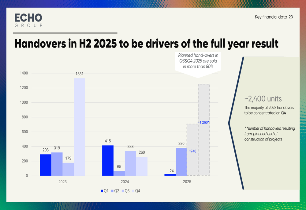 Echo Investment handed over 380 apartments in Q2 2025, with the majority concentrated in Wrocław and Łódź. The company expects a significant increase in handovers during H2 2025, with 1,260 units planned for Q3 and Q4, and a total of 2,400 units for the remainder of the period.