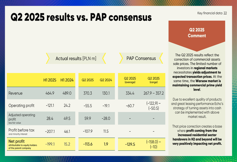Echo Investment reported mixed financial results for H1 2025, with revenue of PLN 464.9 million, down from PLN 489.0 million in H1 2024. More concerning was the operating profit, which turned negative at PLN -121.1 million compared to a positive PLN 24.2 million in the same period last year. The company attributes this decline to fair value adjustments resulting from asset divestments aligned with its strategic shift.