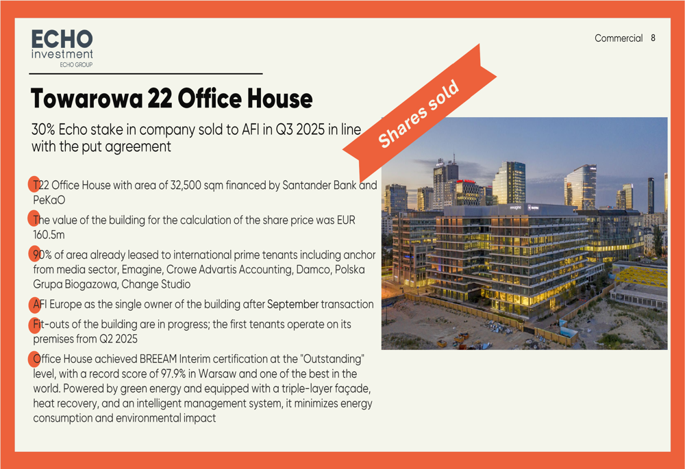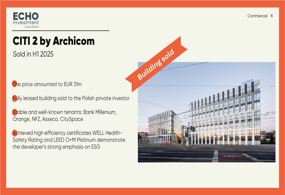 Echo Investment also completed the sale of CITI 2 by Archicom for EUR 31 million in H1 2025. The fully leased building hosts tenants including Bank Millennium, Orange, NFZ, Asseco, and CitySpace, and has achieved WELL Health-Safety Rating and LEED O+M Platinum certifications.