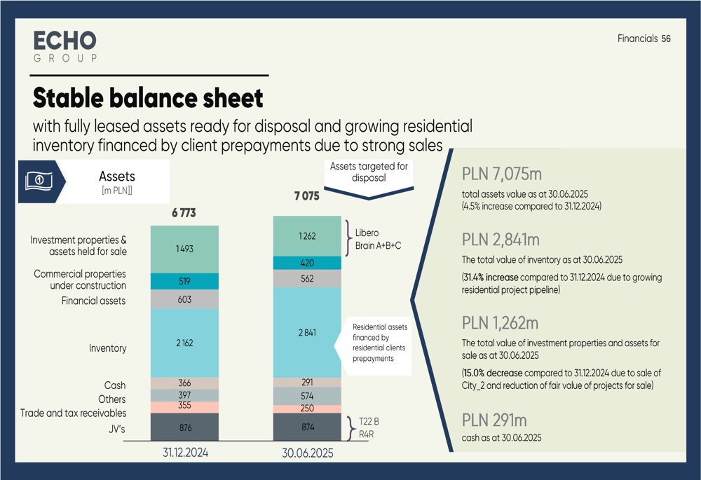 Despite the overall financial challenges, Echo Investment maintains that its underlying business remains strong. The company’s balance sheet shows stability with fully leased assets ready for disposal and growing residential inventory financed by client prepayments due to strong sales.